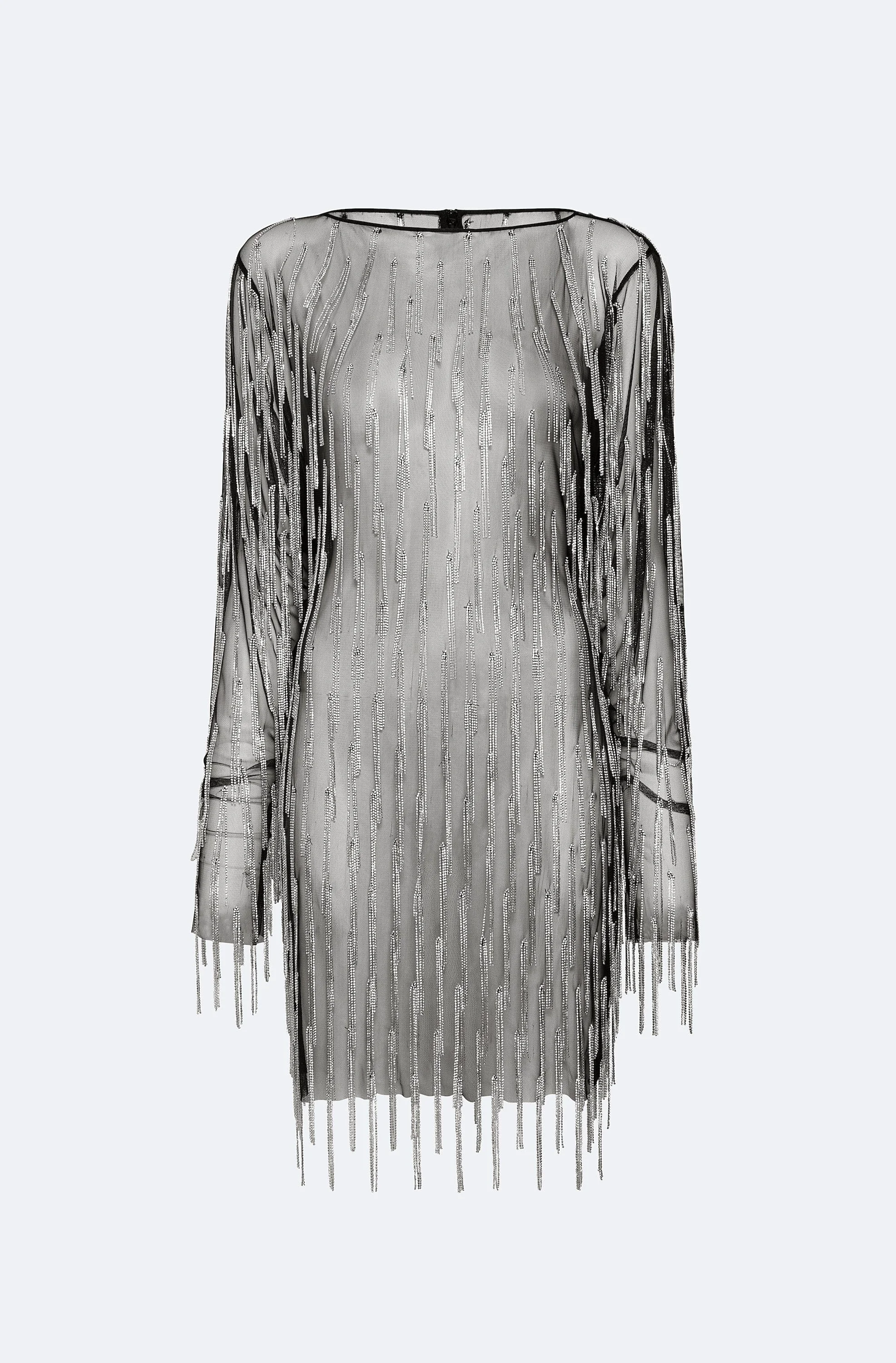 Long sleeve boatneck mini dress in our sheer, mesh diamond fringe embroidery. Fastens with zipper at back neck. - Material: 100% Nylon - Care: Hand Wash Cold or Dry Clean - Fit: True to size - Model is 5'10 and Wearing a Size 2