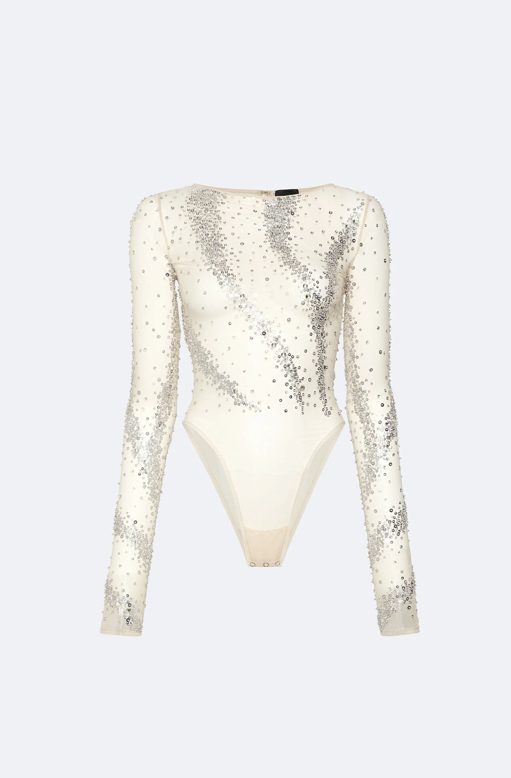 Our bestselling, long sleeve bodysuit elevated in a sheer, delicate rhinestone swirl embroidery. Features zipper at back neck and button closure. - Material: 82% Polyamid, 18% Elastane - Care: Hand Wash Cold or Dry Clean - Fit: True to size - Model is 5'10 and Wearing a size 2