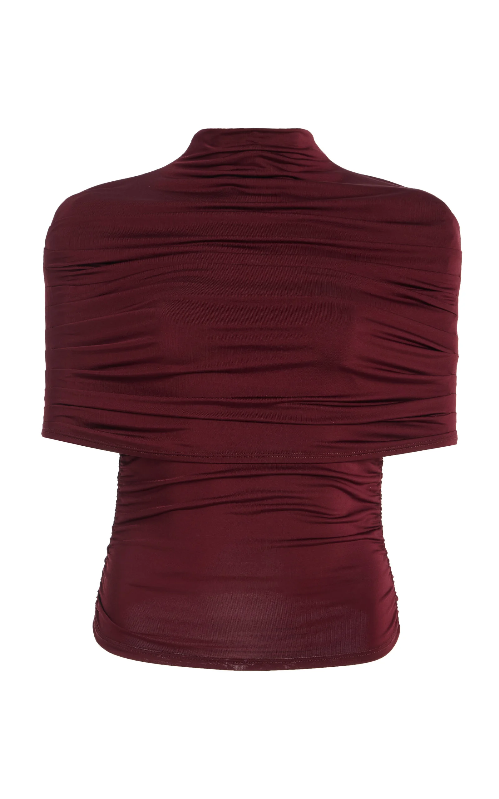 The NYC mainstay continues to put a notably edgy spin on her signature glossy yet slouchy luxe glamour. Find her signatures an impressive display of eco-certified fabrics. This high-neck top has a ruched design made from stretchy jersey with a cape-like overlay. PRODUCT DETAILS - Resort '26 - Slip on - Composition: 94% acetate, 6% elastane - Designer color: Crimson - Dry clean - Imported