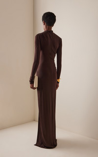The NYC mainstay continues to put a notably edgy spin on her signature glossy yet slouchy luxe glamour. Find her signatures an impressive display of eco-certified fabrics. Cut from fluid jersey, this slinky gown features a draped high neckline, figure-hugging silhouette, and gathered ruching that leads into a thigh-high slit. Accessorize boldly. PRODUCT DETAILS - Fall '25 - Concealed zip fastening along back - Composition: 94% acetate, 6% elastane - Dry clean SIZE & FIT - Our model is wearing a size Small - Model is 5'10” with a 31” bust, 23.5” waist, and 33.5” hip - Fits true to size, our fit specialist recommends taking your normal size