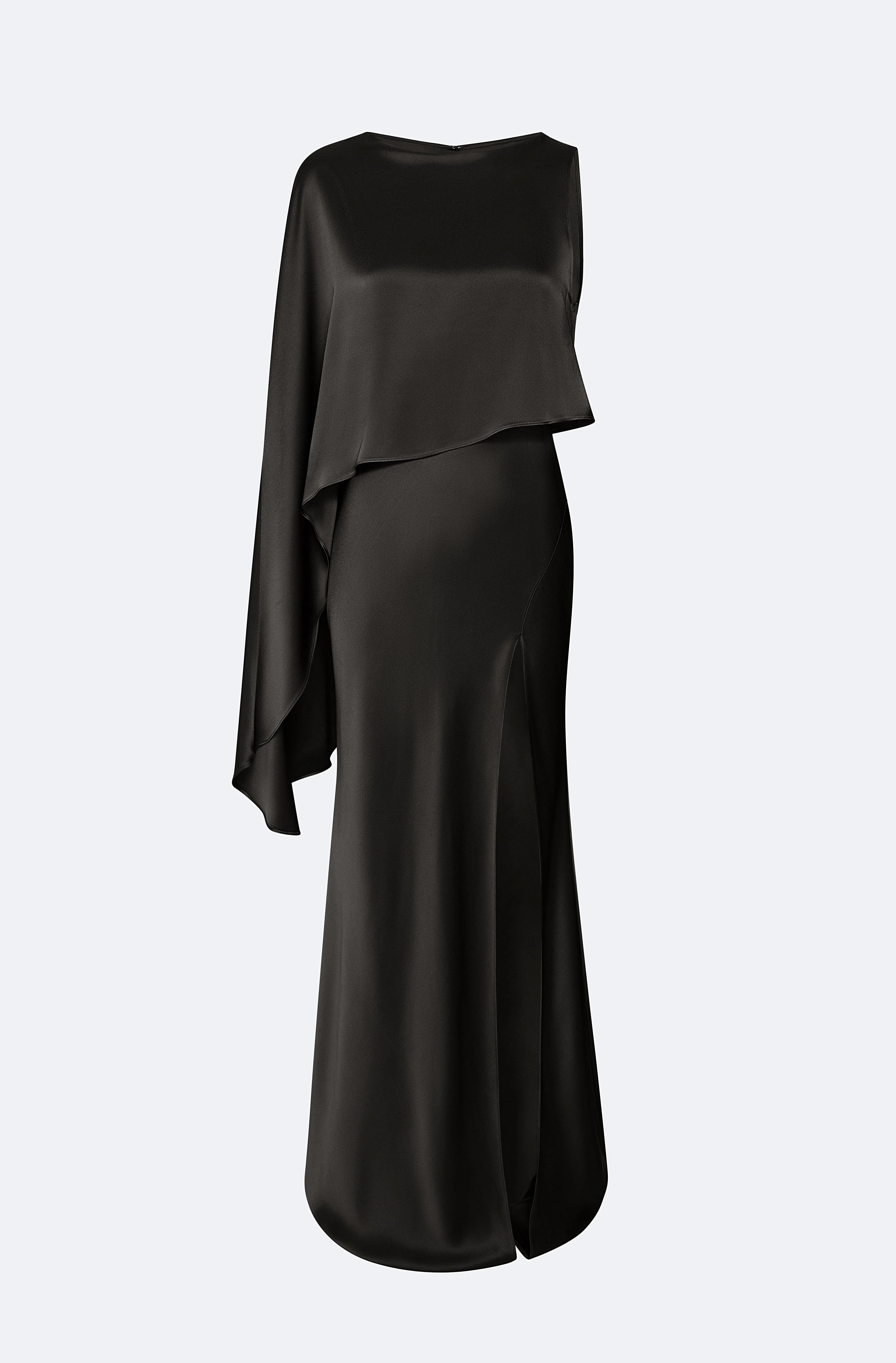Featured in the Summer 25 Collection Asymmetric gown with a draped, layered top in our luxurious doubleface satin. Features side slit and zipper closure at back. - Material: 61% Acetate, 39% Viscose - Care: Hand Wash Cold or Dry Clean - Fit: True to size - Model is 5'10 and Wearing a Size S