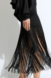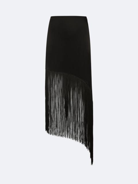 Asymmetric midi skirt in our luxurious doubleface satin. Features fringe trim and side zipper closure. - Material: 61% Acetate, 39% Viscose - Care: Hand Wash Cold or Dry Clean - Fit: True to size - Model is 5'10 and Wearing a Size 2