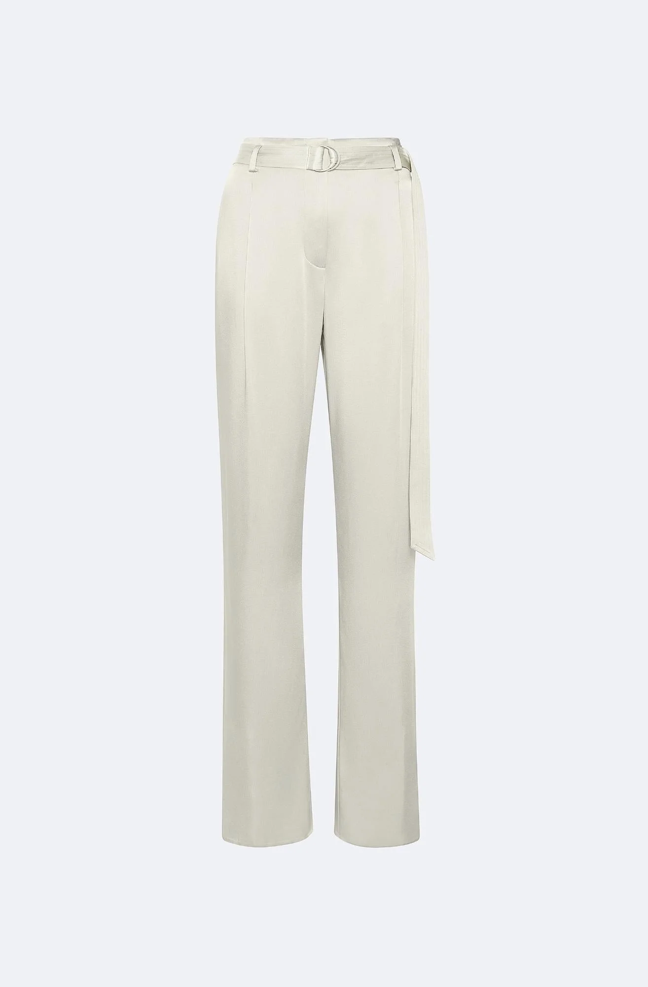 Belted pant in our luxurious doubleface satin. Features D-ring belt at the waist for an adjustable fit. - Material: 61% Acetate, 39% Viscose - Care: Hand Wash Cold or Dry Clean - Fit: True to size. - Model is 5'10 and Wearing a size Small