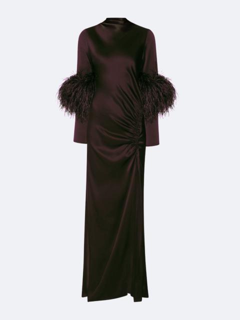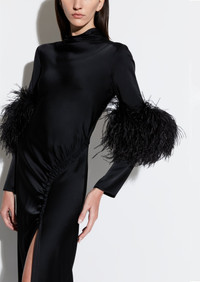 Draped neck gown in our luxurious doubleface satin with feathers on sleeves. Features a shirred tab for adjustable coverage and zipper at center back. - Material: 61% Acetate, 39% Viscose, 100% Struthio Camelus - Care: Professional Dry Clean Only - Fit: This style is cut on the bias and has a naturally looser drape. Size down if you’re between sizes or prefer a more fitted silhouette - Model is 5'10 and wearing a size 2