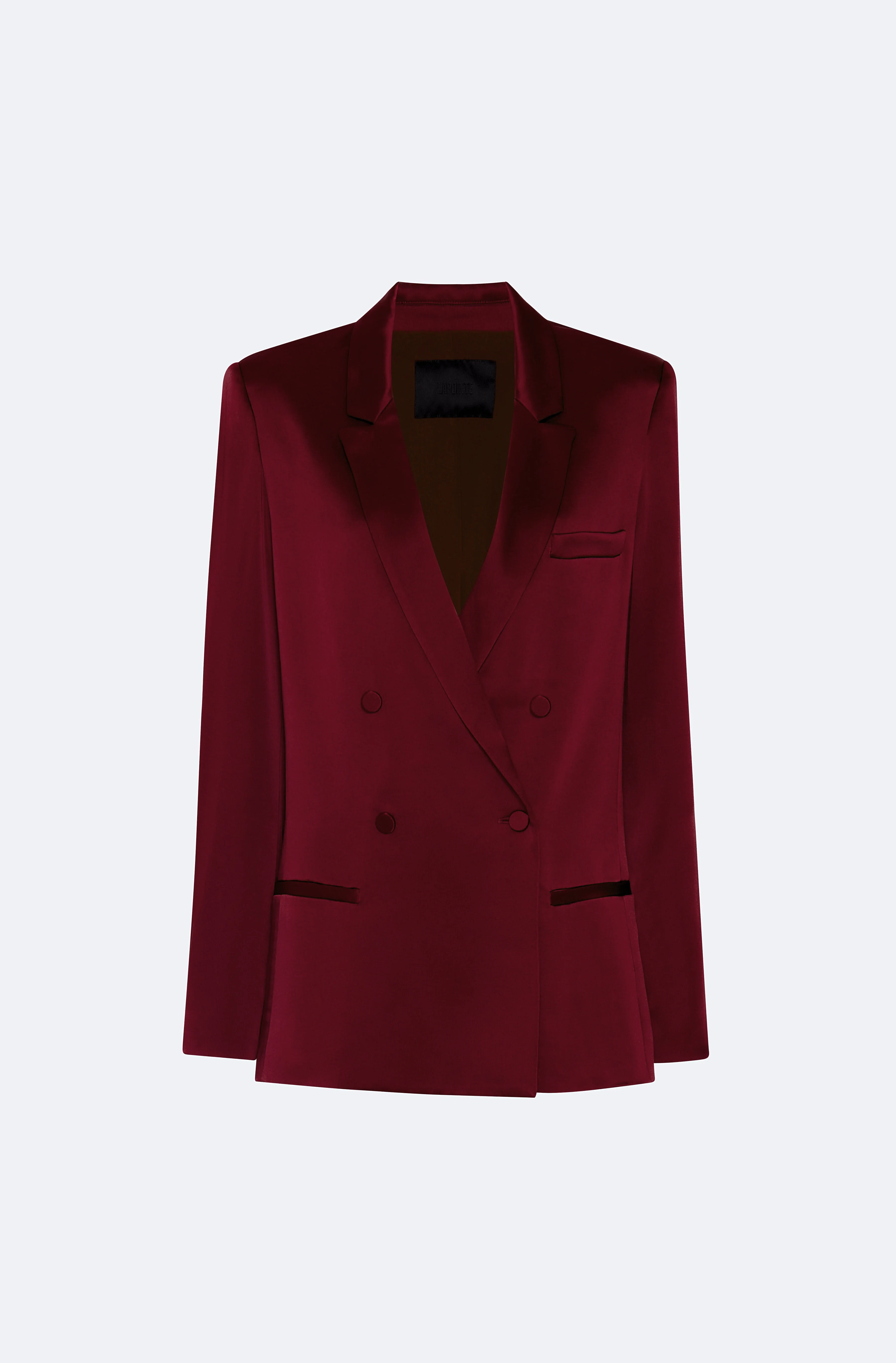 Double breasted blazer in our luxurious double face satin featuring notched lapels and a front button closure. - Materials: 61% Acetate, 39% Viscose - Care: Professional Dry Clean Only - Fit: Designed for an oversized look. Size down down for a more true to size fit - Model is 5'10" and Wearing a 2
