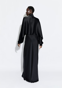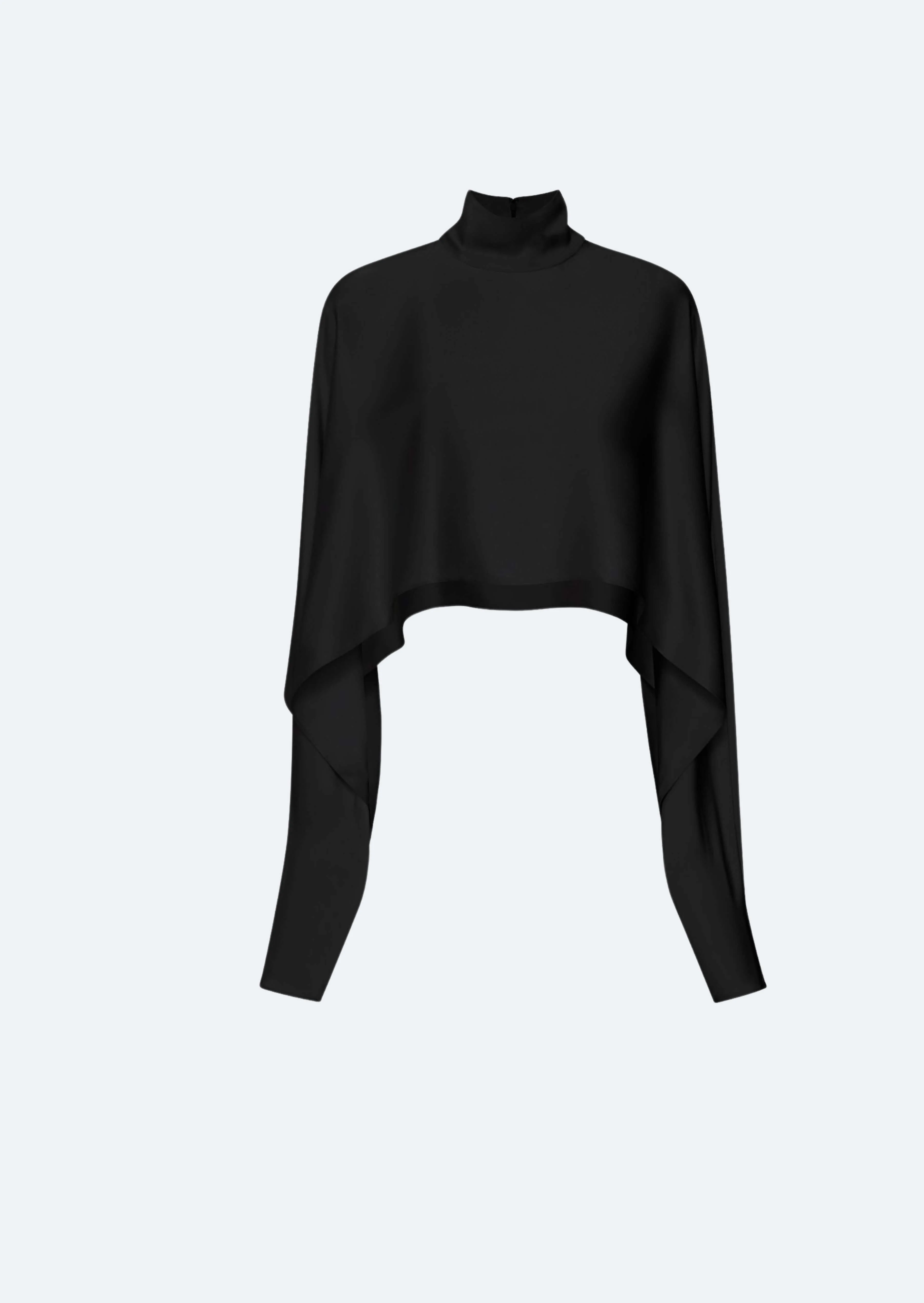 Doubleface satin long sleeve cropped caftan top, mock neck, and hidden zipper at back. Relaxed fit. - Material: 61% Acetate, 39% Viscose - Care: Professional Dry Clean Only