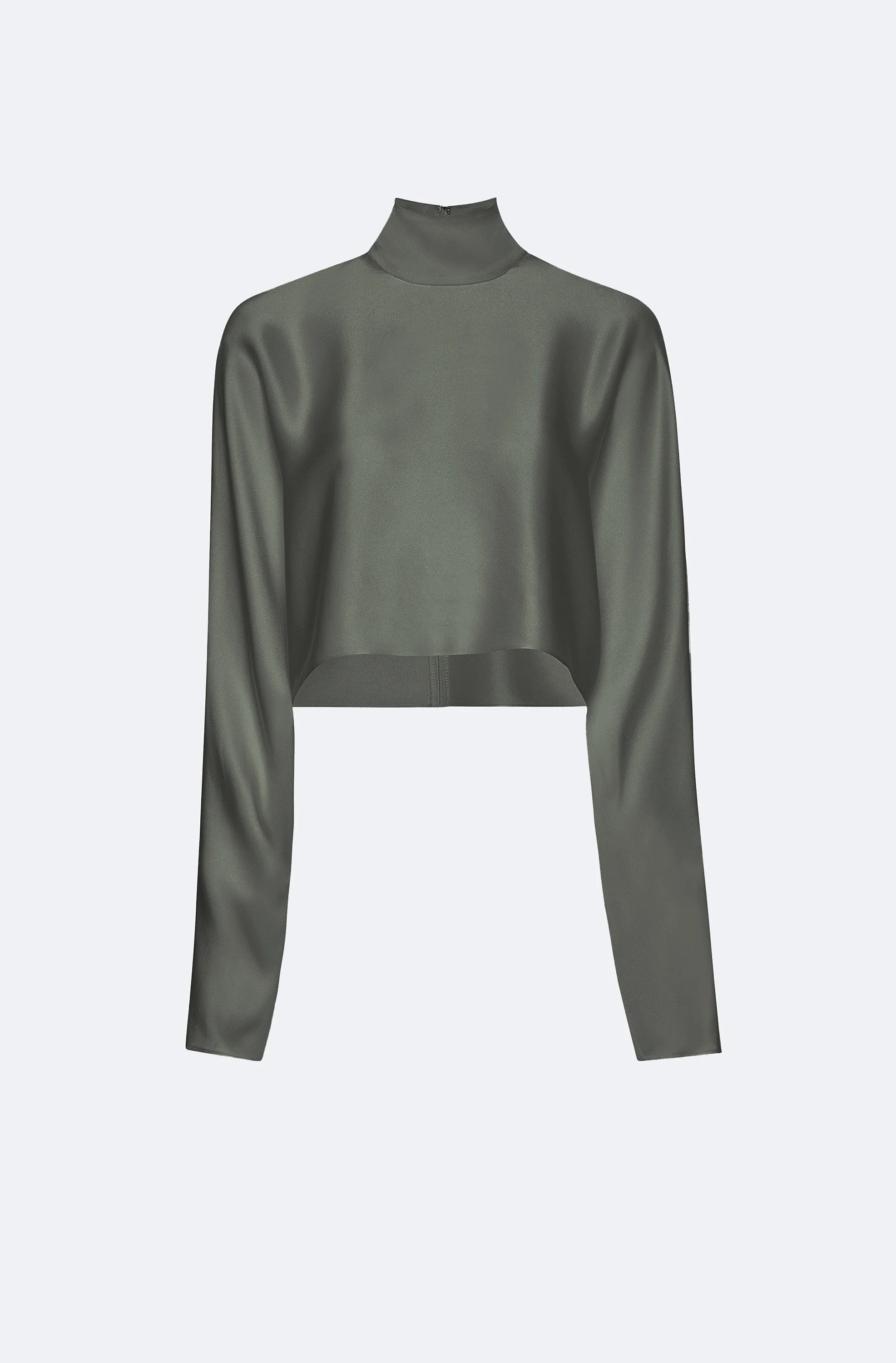 Long sleeve cropped caftan top in our luxurious double face satin with a relaxed fit. Features mock neck, and hidden zipper at back. - Material: 61% Acetate, 39% Viscose - Care: Hand Wash Cold or Dry Clean - Fit: True to size - Model is 5'10 and Wearing a Size S