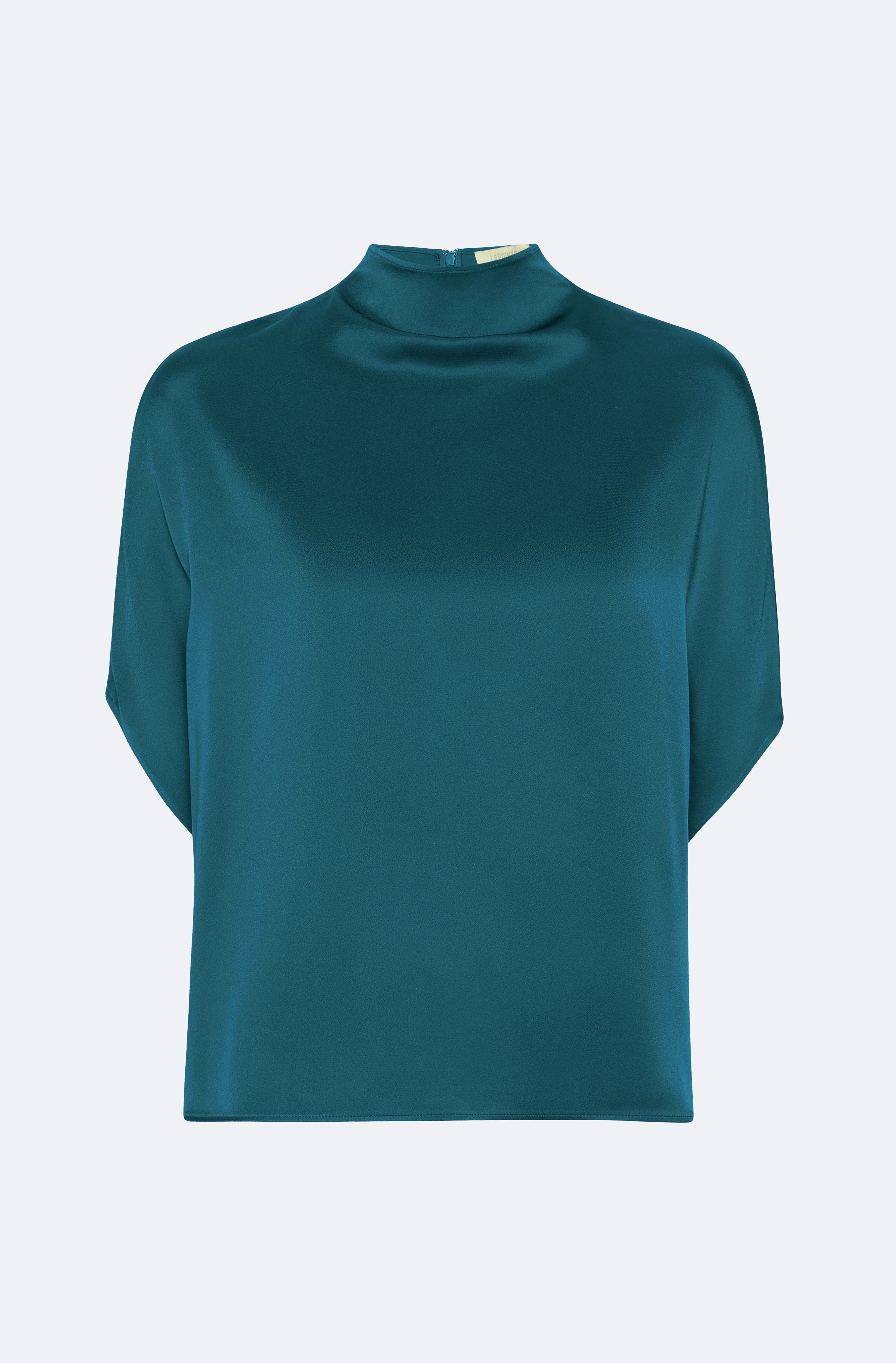 Bestselling cape tee in our luxurious doubleface satin featuring an oversized body to be easily tucked into pants and skirts. Fastens with invisible zipper at center back. - Materials: 61% Acetate, 39% Viscose - Care: Professional Dry Clean Only - Fit: True to size. Designed for an oversized look - Model is 5'10" and Wearing a Size S