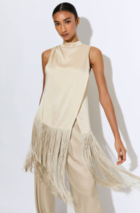Sleeveless fringe top in our luxurious doubleface satin. Features an asymmetric hem with fringe trim. Fastens with back center zip closure. - Material: 61% Acetate, 39% Viscose - Care: Hand Wash Cold or Dry Clean - Fit: True to size - Model is 5'10 and Wearing a Size 2
