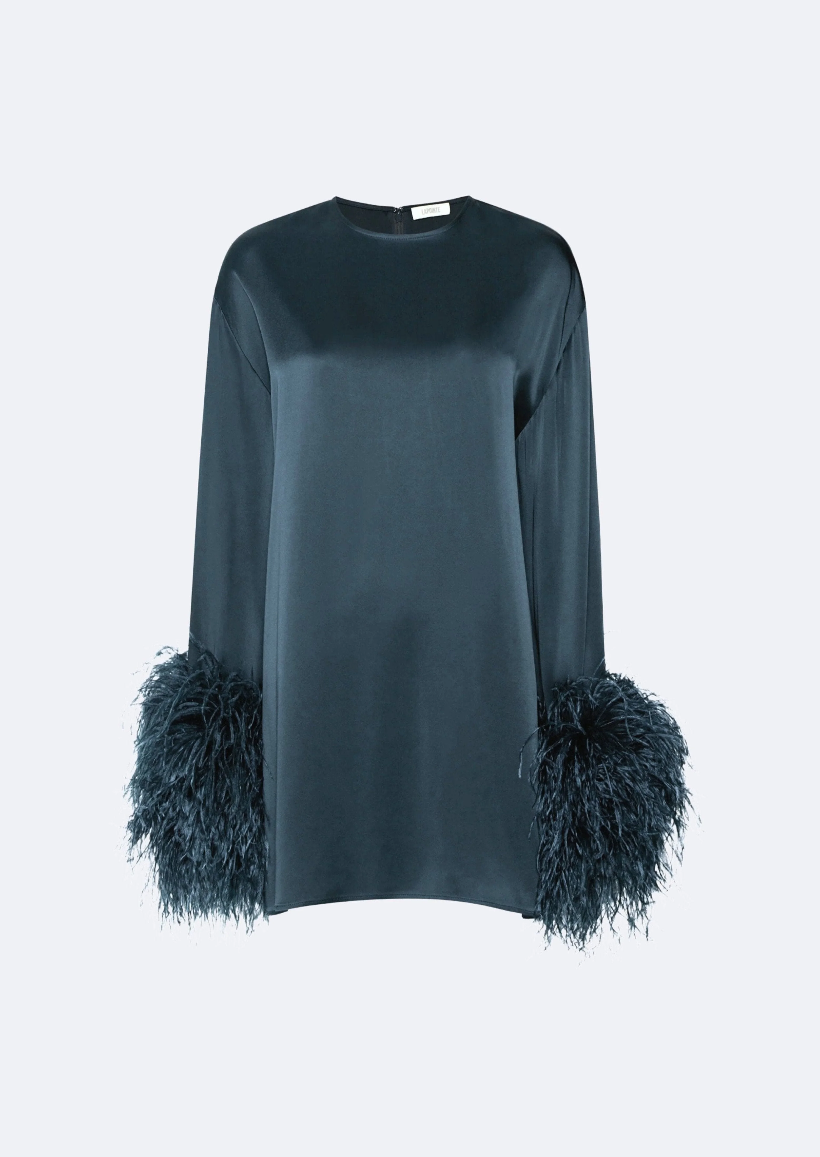 Featured in the Resort 25 Collection Shift dress in our luxurious doubleface satin fabrication. Features feathers at the wrist. - Materials: 61% Acetate, 39% Viscose - Care: Professional Dry Clean Only - Fit: True to size. For a more relaxed fit, size up. - Model is 5'10" and Wearing a S