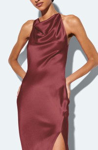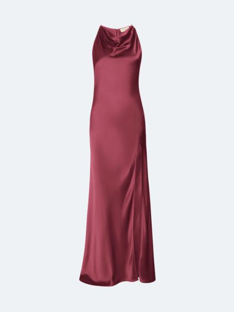 Cowl neck halter gown in our luxurious doubleface satin. Features a slit at front and back zipper closure. - Material: 61% Acetate, 39% Viscose - Care: Hand Wash Cold or Dry Clean - Fit: This style is cut on the bias and has a naturally looser drape. Size down if you’re between sizes or prefer a more fitted silhouette - Model is 5'10 and Wearing a size Small