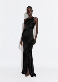 Satin Halter Gown With Feathers