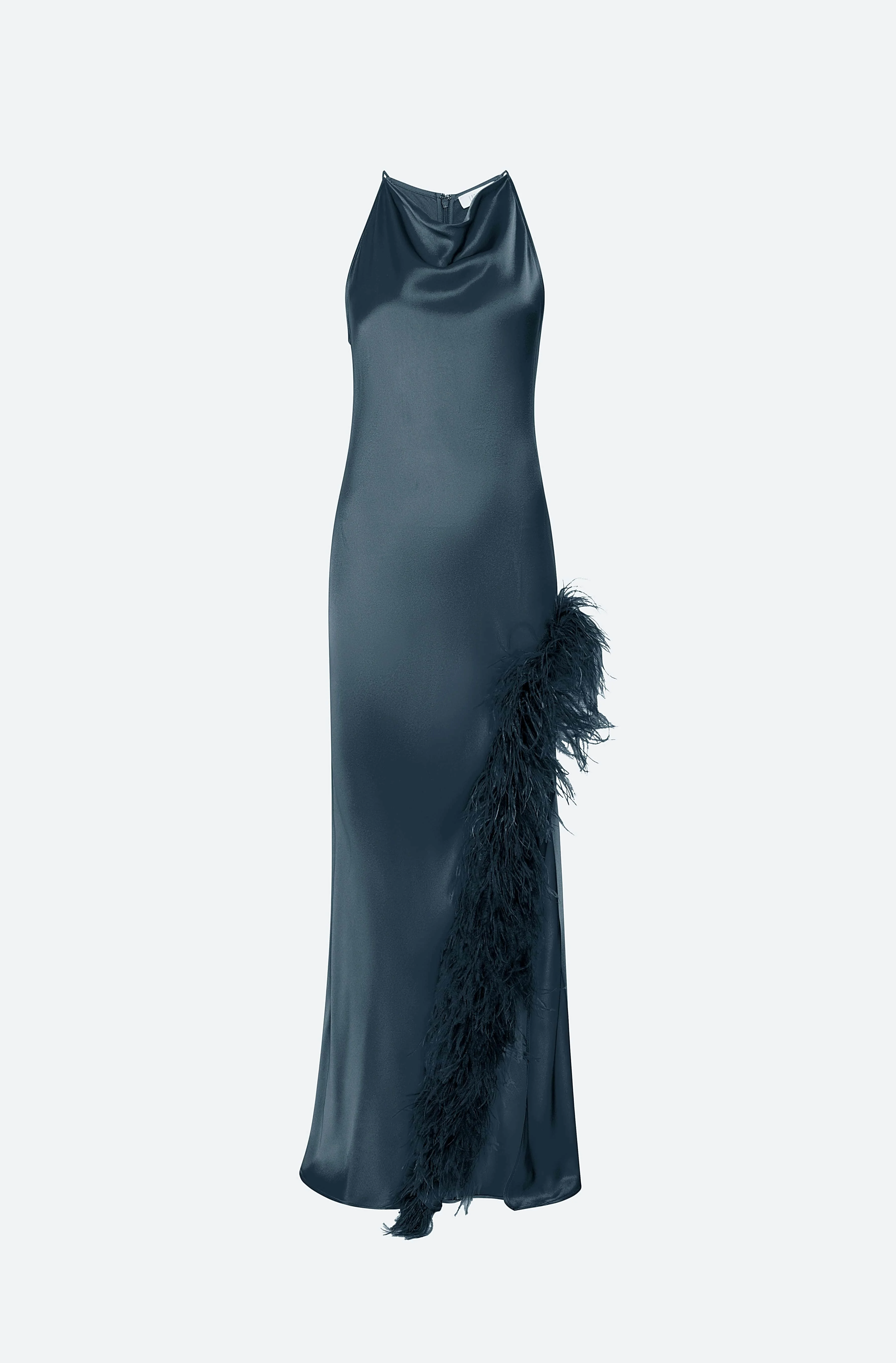 Featured in the Resort 25 Collection Halter gown in our luxurious double face satin. Features a cowl neckline and slit at the front with feathers. - Materials: 61% Acetate, 39% Viscose - Care: Clean by Fur Specialist Only - Fit: True to size. - Model is 5'11" and Wearing a size 2