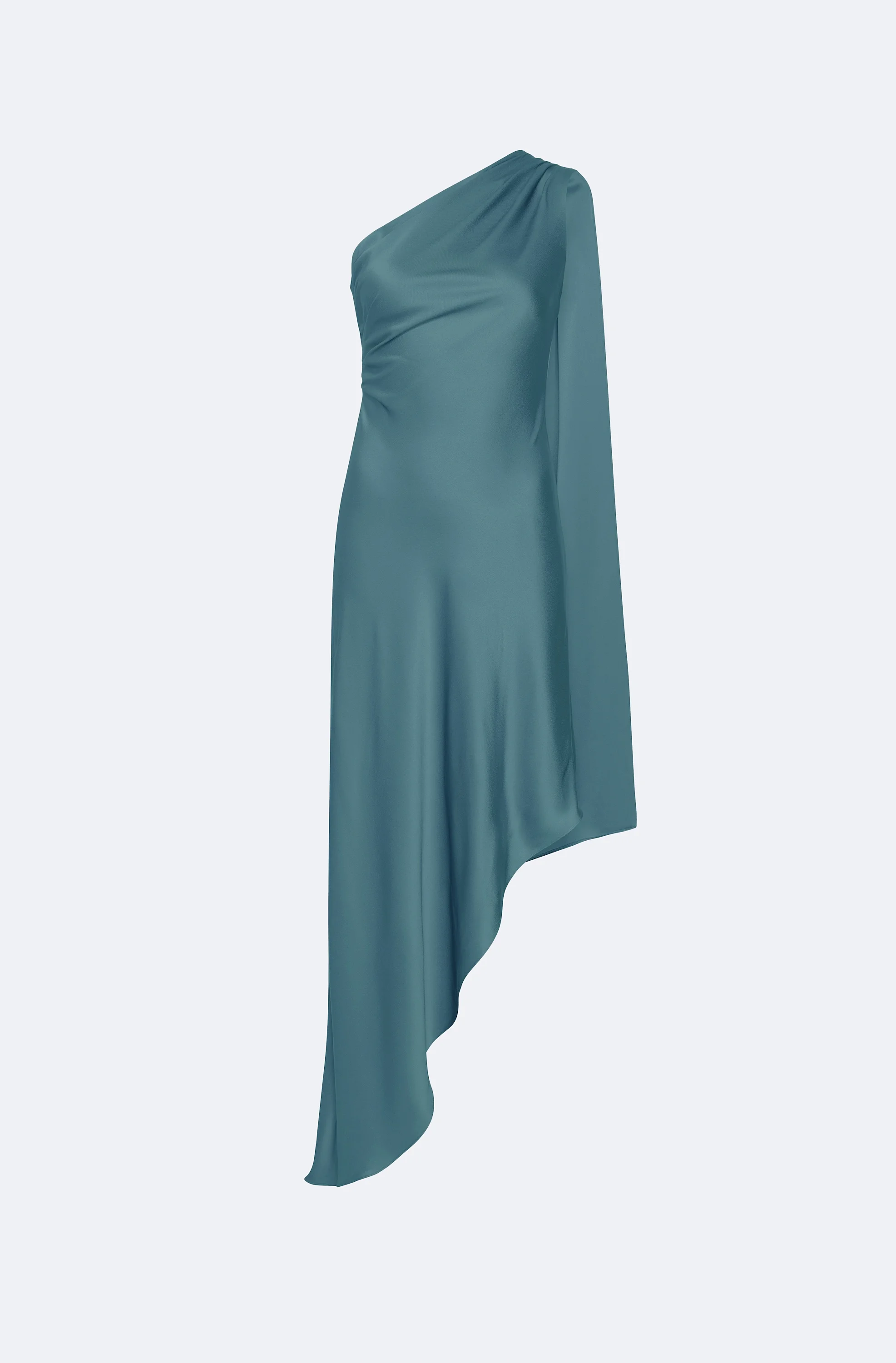 Featured in the Summer 25 Collection One shoulder dress in our luxurious doubleface satin. Features asymmetric hem, draping at back, and side-zipper closure. - Material: 61% Acetate, 39% Viscose - Care: Hand Wash Cold or Dry Clean - Fit: True to size - Model is 5'10 and Wearing a Size 2