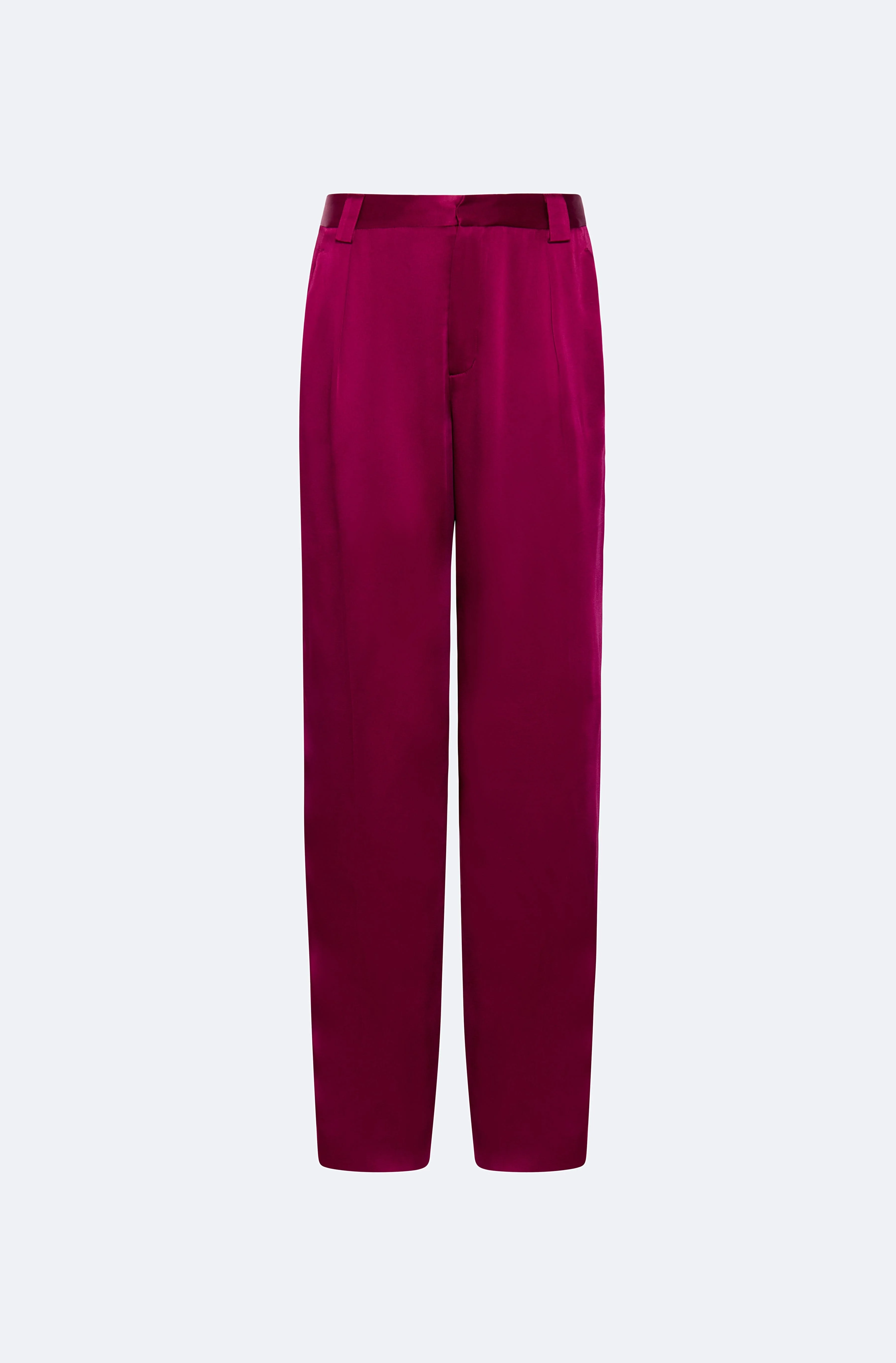 Featured in the Holiday 25 Collection Relaxed pleated pant in our luxurious double face satin. Features a back pocket detail and center front zip closure. Sits at the natural waist. - Material: 61% Acetate, 39% Viscose - Care: Dry Clean Only - Fit: True to size. - Model is 5'11" and wearing a size 2