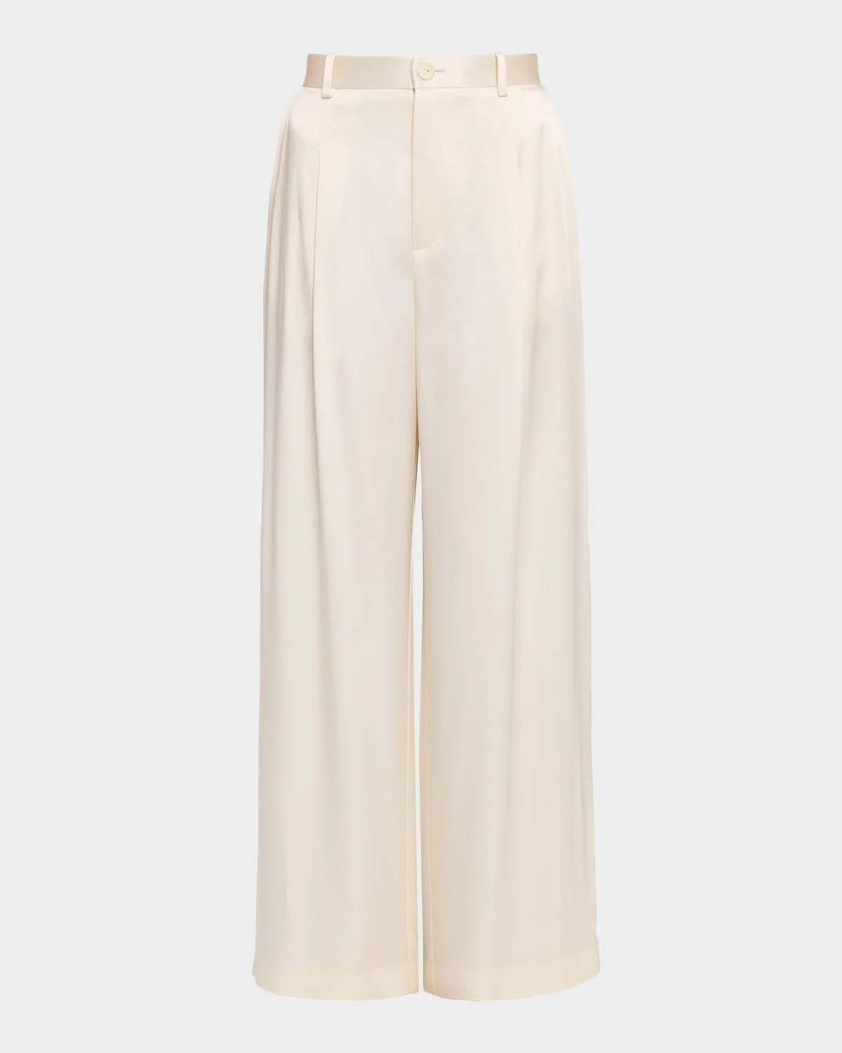LAPOINTE satin pants fetauring a pleated front Mid rise sits high on hip Side slip pockets; back flap pockets Relaxed straight legs Full length Button/zip fly; belt loops Acetate/viscose Made in USA