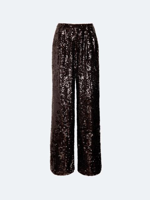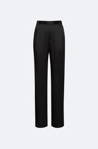 Relaxed pleated pant in our luxurious double face satin. Features a back pocket detail and center front zip closure. Sits at the natural waist. - Material: 61% Acetate, 39% Viscose - Care: Dry Clean Only - Fit: True to size. For a more relaxed fit, size up. - Model is 5'11" and wearing a size 2