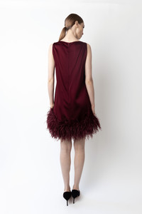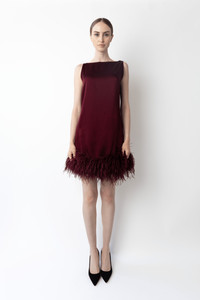 Sleeveless mini dress in our luxurious double face satin with feathers on the hemline. Features an invisible zipper at center back. - Material: 61% Acetate, 39% Viscose, 100% Struthio Camelus - Care: Professional Dry Clean Only - Fit: True to Size - Model is 5'10" and Wearing a S