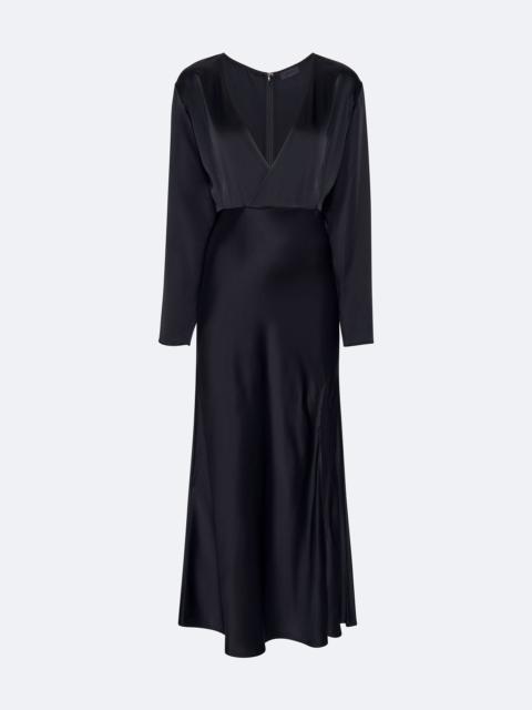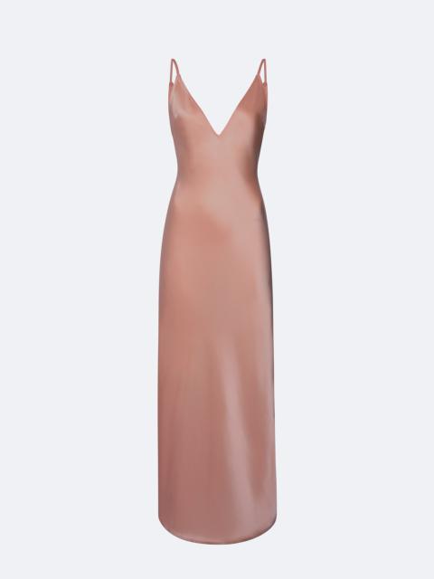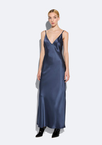 This double-face satin v-neck slip dress features a moderately low back and column silhouette. - Materials: 61% Acetate, 39% Viscose - Care: Dry Clean Only - Fit: True to Size - Model is 5'10 and Wearing a size 2