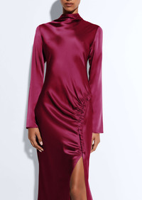 Tab gown in our luxurious double face satin fabrication. Shirred tab allows for adjustable coverage at the leg. Invisible zipper at the center back. - Materials: 61% Acetate, 39% Viscose - Fit: True to size. For a slimmer fit, size down. - Care: Dry Clean Only