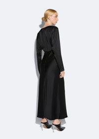 This double-face satin v-neck dress features a side slit, waist seam and a side invisible zipper closure. - Materials: 61% Acetate, 39% Viscose - Care: Dry Clean Only - Fit: True to Size - Model is 5'10 and Wearing a size 2
