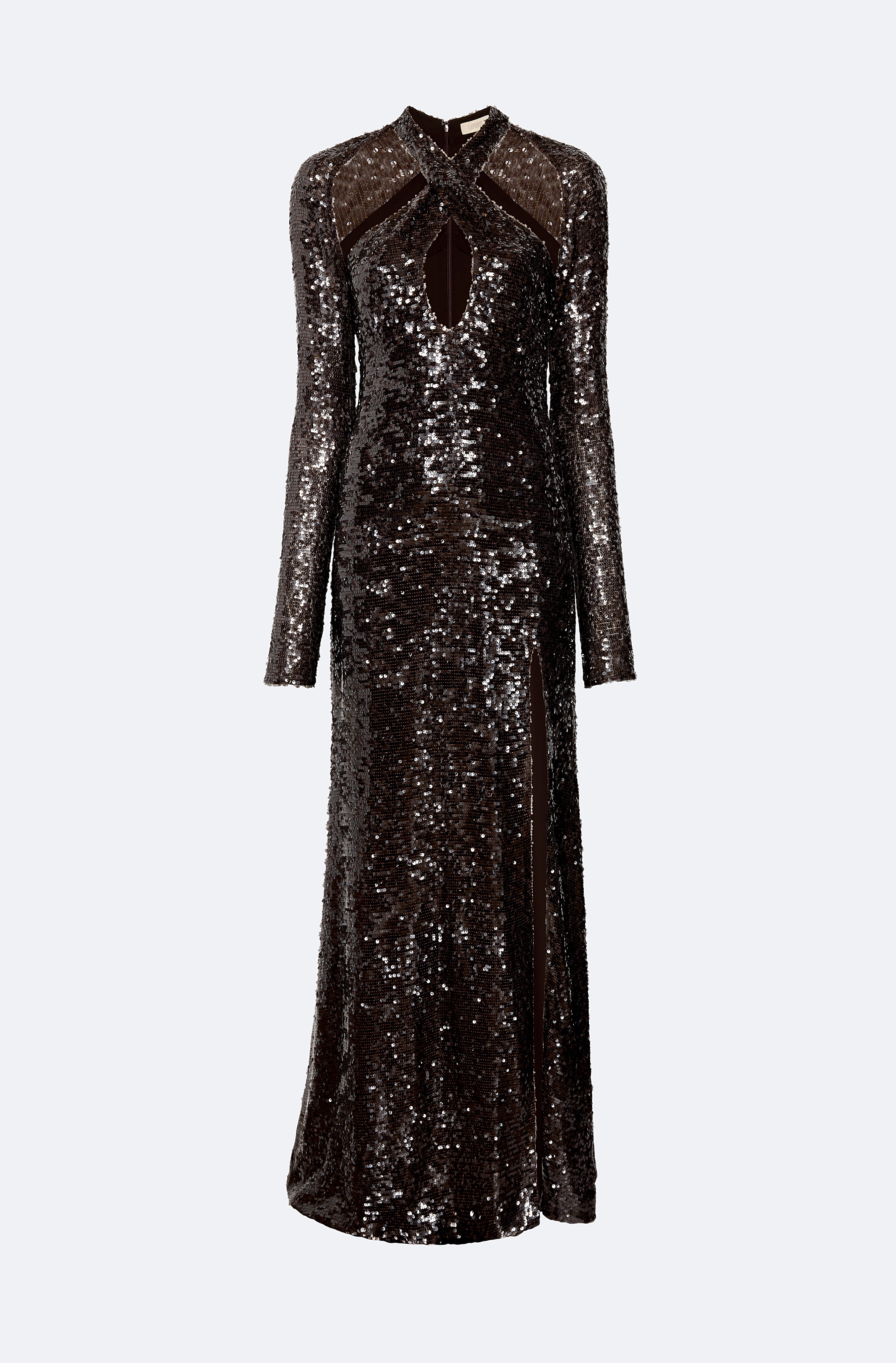 Sequin Viscose Long Sleeve Keyhole Gown With Slit And Center Back Hidden Zipper Closure. - Material: 100% Viscose. - Care: Dry Clean Only - Fit:True To Size - Model Is 5'10" And Wearing a 2