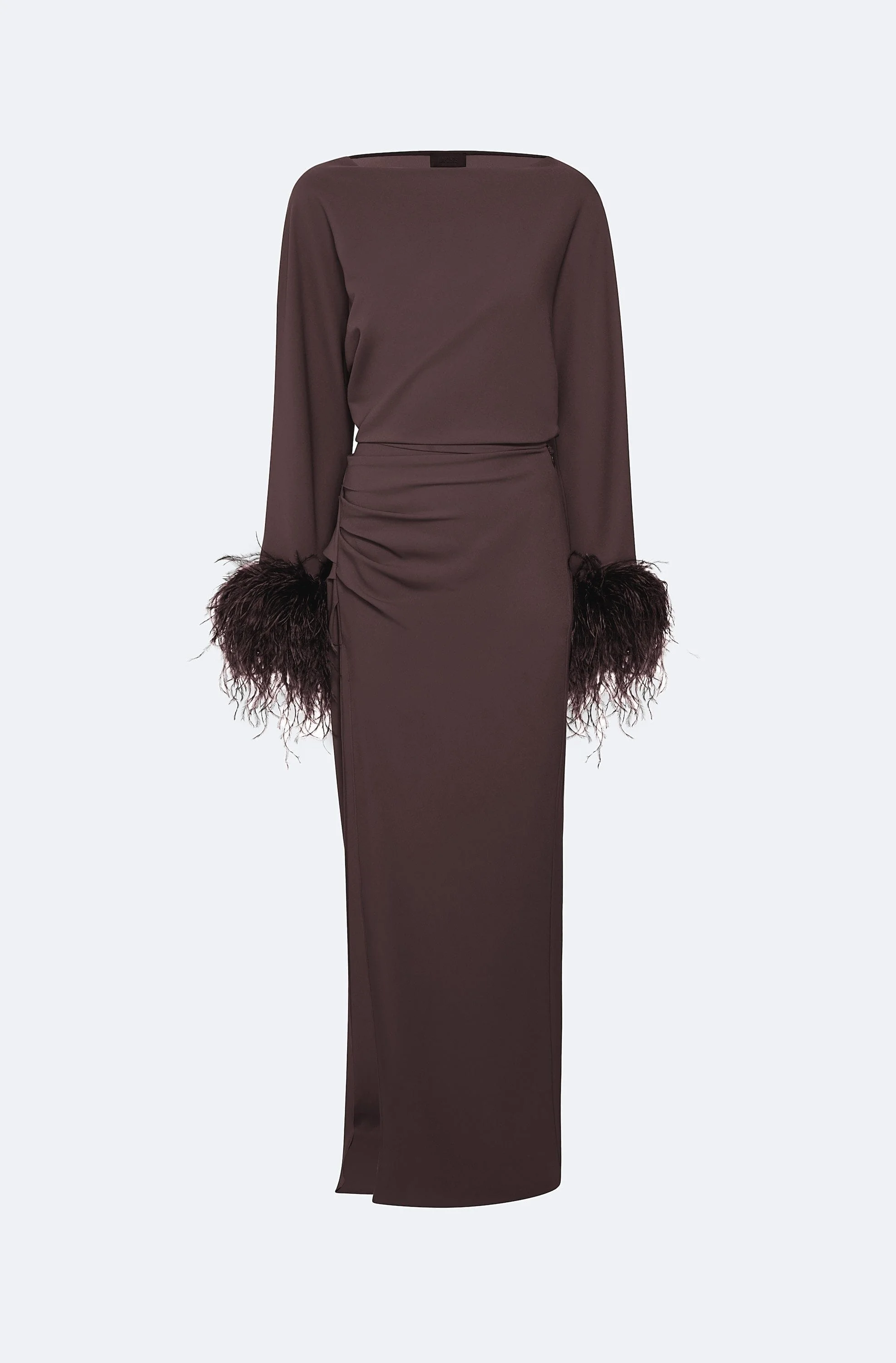 Stretch Drape Crepe Off The Shoulder Dress With Feathers