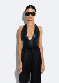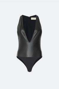 Stretch faux leather bodysuit with a deep V neckline and hidden zipper at back. True to size. - Material: 48% Polyurethane, 48% Polyester, 5% Spandex - Care: Hand Wash or Dry Clean