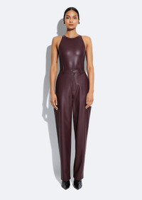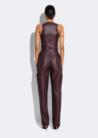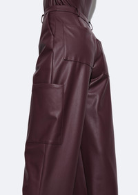 Featured In The Fall 2024 Collection This stretch faux leather trouser features a tapered leg with discreet cargo pockets, hook closure and pant fly zipper. - Materials: 48% Polyurethane, 47% Polyester, 5% Spandex - Care: Hand Wash Cold or Dry Clean Only - Fit: Relaxed fit. True to Size - Model is 5'10" and Wearing a 2