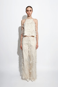 Slouchy pant in our everyday stretch cotton twill. Features all-over feather embroidery and zip-front button closure. Sits at the natural waist. - Material: 98% Cotton, 2% Elastane, 100% Struthio Camelus - Care: Professional Dry Clean - Fit: True to size - Model is 5'10 and Wearing a size Small