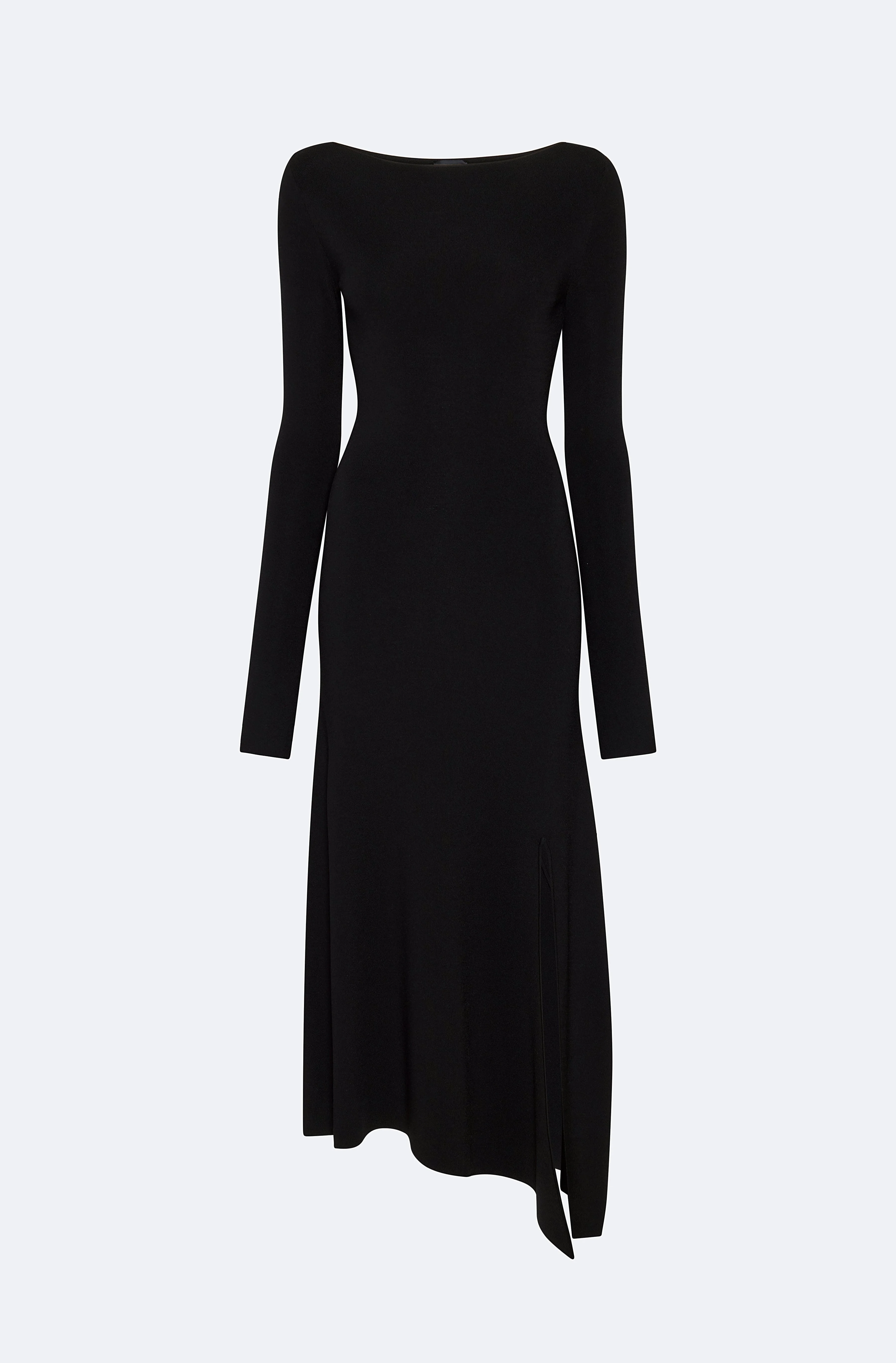 Featured in the Holiday 25 Collection Boatneck dress in our bestselling matte viscose fabrication. Features slits at the wrists and at the asymmetric hemline. - Material: 83% Rayon Viscose, 7% Elite Polyester - Care: Hand Wash Cold or Dry Clean - Fit: True to size. - Model is 5'11" and Wearing a size Small