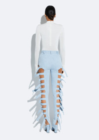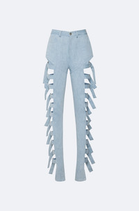 Featured In The Fall 2024 Runway Collection This washed denim pant features adjustable side buckets throughout the length of the leg with classic five pocket denim jean details. - Materials: 100% Cotton - Care: Professional Care Only - Fit: Slim fit. True to Size - Model is 5'10" and Wearing a 2