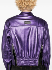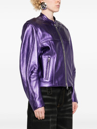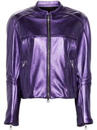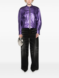 metallic leather bomber jacket Highlights - Grape purple - Calf leather - Metallic finish - Band collar - Drop shoulder - Long sleeves - Cuff zips - Front zip fastening pockets - Logo patch to the rear - Rear elasticated hem - Front two-way zip fastening Made in United States Composition Outer: Calf Leather 100% Lining: Silk 92%, Spandex/Elastane 8% SIZE & FIT Model measurements Height 5 ft 9 in(1.75 m) Bust/Chest 34.64 in(88 cm) Hips 36.61 in(93 cm) Waist 26.37 in(67 cm) FittingInformation Designed to be unstructured, offering a loose fit throughout The internal shoulder pads offer a structured shape Soft leather has a supple and smooth construction offering some flexibility This piece fits true to size – take your usual size