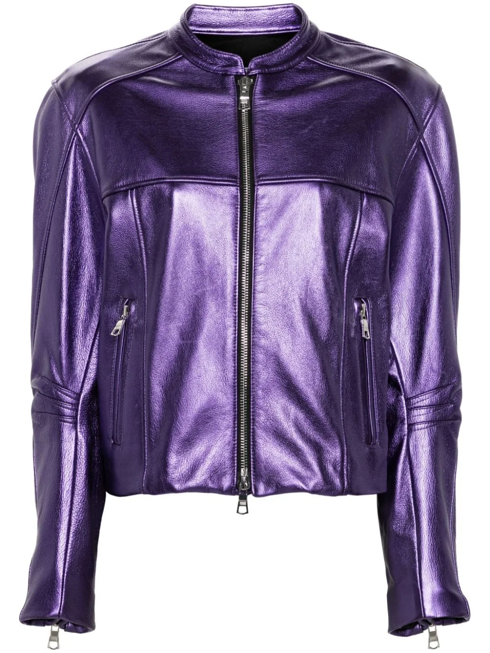 grape purple calf leather metallic finish band collar drop shoulder long sleeves cuff zips front zip fastening pockets logo patch to the rear rear elasticated hem front two-way zip fastening - Color: PURPLE - Made in: United States - Designer Style ID: LSS24O-007 GRAPE Composition and care Lining Composition Silk: 92.0%, Outer Composition Calf Leather: 100.0%, Lining Composition Spandex/elastane: 8.0%