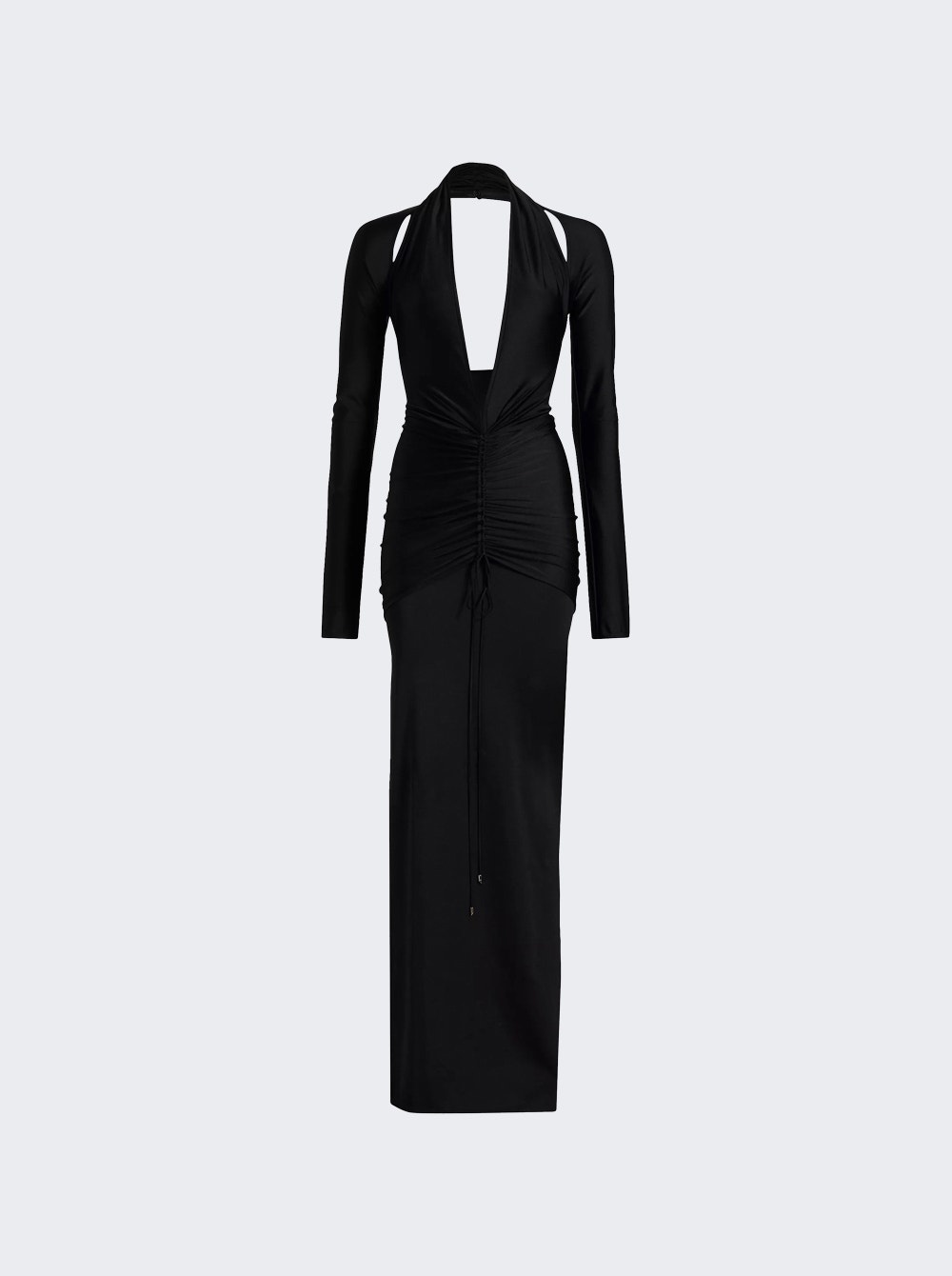 Details - Fitted silhouette - Maxi length - Long sleeves - Plunge neckline - Shoulder cutouts - Ruching at center - Adjustable drawstring - Unlined - Care according to label - Material: 80% nylon, 20% spandex - Model is 5'9"/175cm and is wearing a size S Brand Style: LSS25G-018 Designer/Brand: LAQUAN SMITH