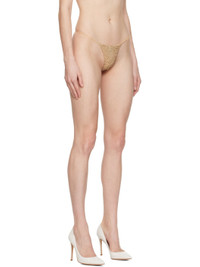 Stretch polyester mesh thong. Crystal-cut detailing throughout. · Partially elasticized waistband · Full stretch mesh lining Supplier color: Gold Body: 93% polyester, 7% spandex. Lining: 90% nylon, 10% spandex. Made in United States 222779F081000