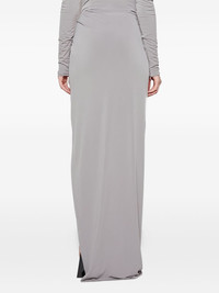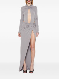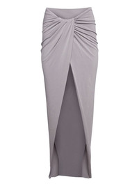 knotted slit skirt Highlights - Stone - Knot detail - Front slit - Maxi length - Draped detail - Gathered detail Made in United States Composition Polyester 94%, Spandex/Elastane 6%