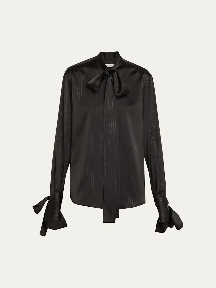 Bow-Neck Metallic Pinstripe Satin Blouse
