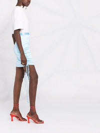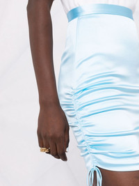ruched-detail mini skirt baby blue stretch satin ruched detailing drawstring fastening high-waisted straight hem stretch-design Made in United States Composition Acetate 57%, Nylon 37%, Lycra 6% SIZE & FIT Model measurements Height 5 ft 11 in(1.8 m) Bust/Chest 32.67 in(83 cm) Hips 36.22 in(92 cm) Waist 24.4 in(62 cm) FittingInformation This piece fits true to size. We recommend you get your regular size Cut for a slim fit Made with a mid-weight stretch fabric Washing instructions Dry Clean Only