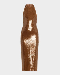 - LaQuan Smith sequin embellished dress featuring an open back with a satin belted strap - Halter neckline; self-tie back - Sleeveless - Sheath silhouette - Hem falls below the knee - Center-bsck slit hem - Back zip - Polyester/spandex - Dry clean - Made in USA from imported materials
