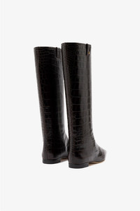 Sleek, refined, and endlessly versatile, this classic high boot is the ultimate wardrobe staple. Crafted in a dark croco-effect leather with a flattering, elongating silhouette, it has a timeless shape with just the right amount of edge—the kind of boot you’ll reach for season after season. - Dark oak - Soft croco leather - Closed squared toe - Larroude "L" logo in golden hardware - Finely crafted leather sole for support, durability, and comfort - Insole with memory foam cushion and hot stamp logo - Peel off the protector before using your shoe - Handmade in Brazil