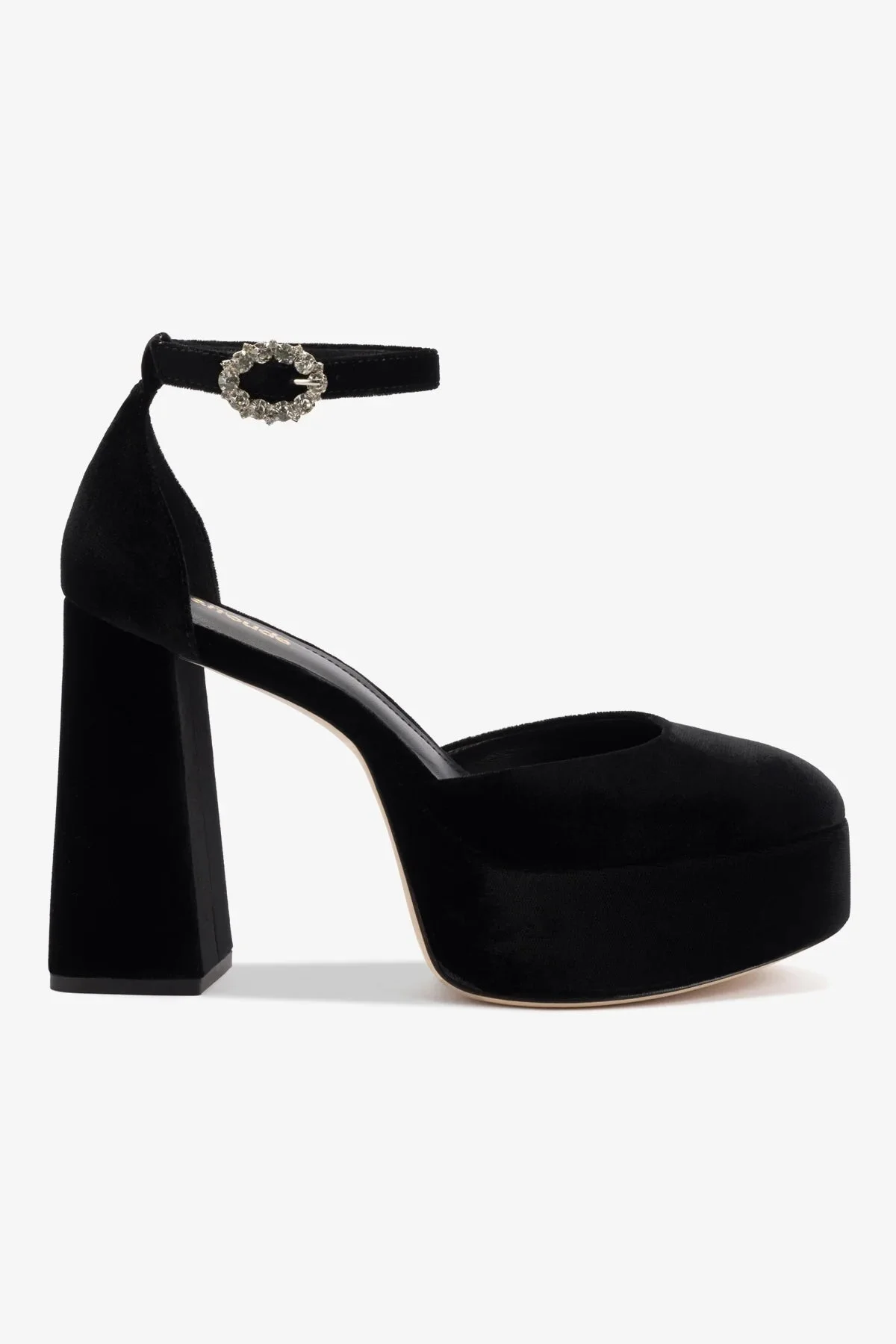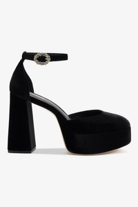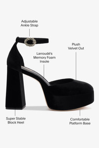 With the same perfect platform and pitch as our bestselling Dolly silhouette, the new Ari brings adds an element of prep in this new mary jane style. Equal parts Upper East Side and downtown cool, this black velvet pair is lush for Fall, yet still begs for yearround wear. - Black - Velvet fabric - Closed round toe - Adjustable ankle strap - Stoned buckle - 4.5 inch block heel - 1.5 inch platform - Finely crafted leather sole for support, durability, and comfort - Insole with memory foam cushion and hot stamp logo - Handmade in Brazil