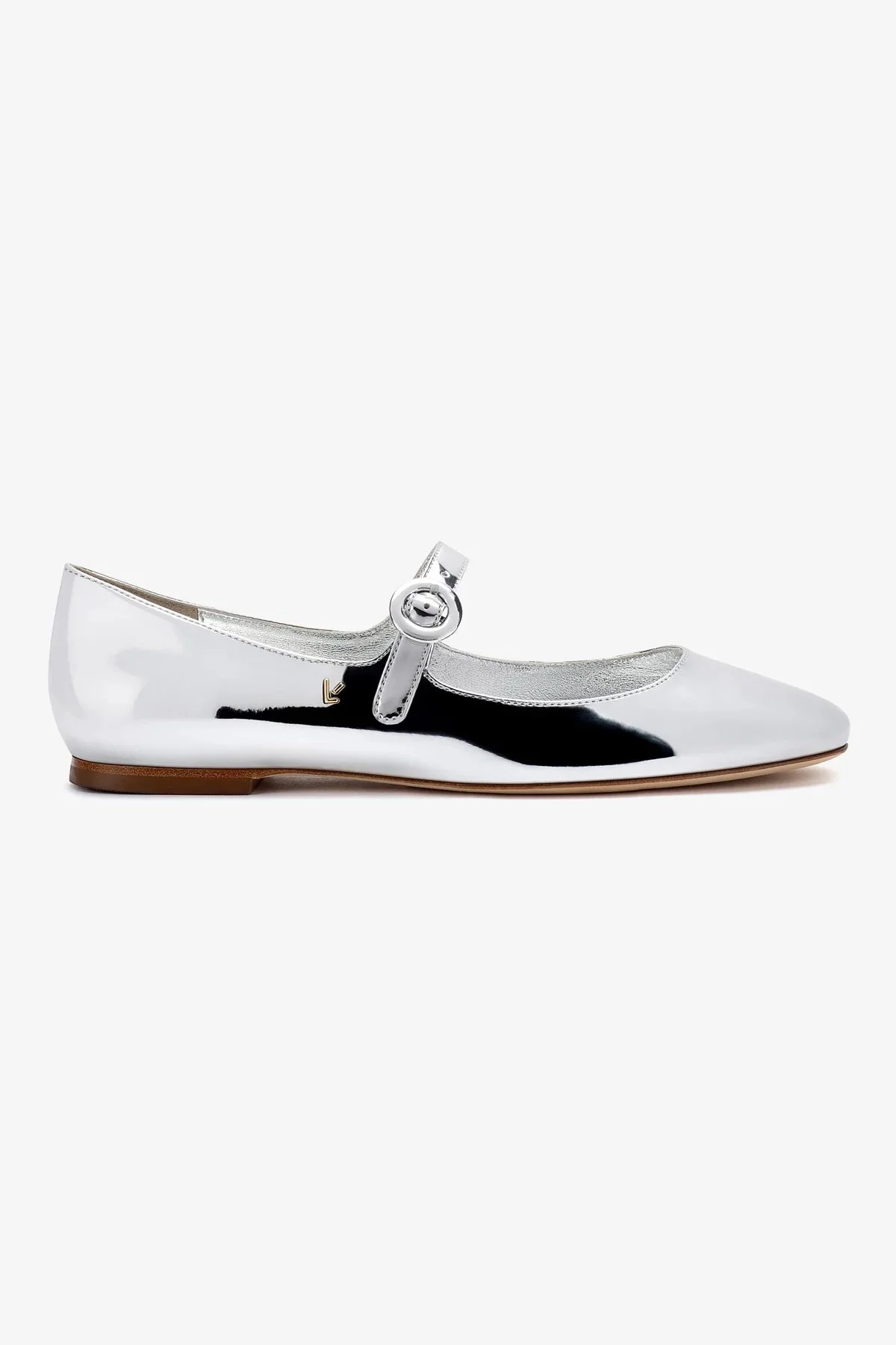 An adorable new mary jane with modern details that keep it fresh. We've added this chic new flat to the collection this Fall with a sleek base and adjustable ankle fastening in a radiant silver leather that shines bright day or night. - Silver mirror - Specchio leather - Closed round toe - Larroude “L” logo in golden hardware - Finely crafted leather sole for support, durability, and comfort - Insole with memory foam cushion and hot stamp logo - Handmade in Brazil