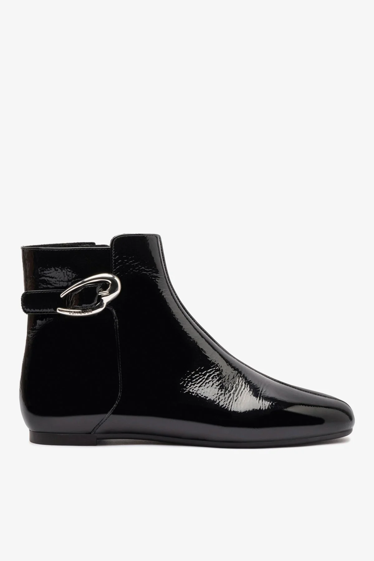 Versatile, minimal, and made to move with you, this sleek ankle bootie is designed for ease, with a slip-on silhouette and a chic, adjustable tab closure for a customized fit. Set on a comfortable flat sole, it’s equal parts practical and polished. - Black - Patent show leather - Closed round toe - Silver hardware - Finely crafted leather sole for support, durability, and comfort - Insole with memory foam cushion and hot stamp logo - Peel off the protector before using your shoe - Handmade in Brazil