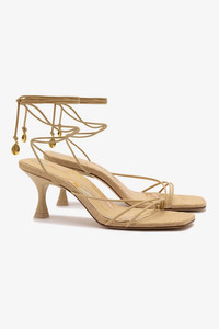 A barely-there neutral sandal with charm to spare, the Nadia is a delightful new addition to High Summer. Barely-there straps atop a kitten heel wrap around the ankle any which way, with playful shell adornments that dangle off the ends that can be featured front or as a lasting impression in the back. - Beige - Kid skin leather - Open round toe - 2.6 inch kitten heel - Non-removable charms - Finely crafted leather sole for support, durability, and comfort - Insole with memory foam cushion and hot stamp logo - Peel off the protector before using your shoe - Handmade in Brazil