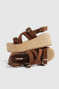 Flatform sandal crafted in brown suede leather with wide crossed straps and adjustable buckle closures. The raffia-wrapped platform sole adds texture and a natural finish, while the flat construction ensures stability and comfort for all-day wear. Style with linen dresses, midi skirts, or relaxed denim for a casual yet polished look. Also pairs well with lightweight tailoring for warm-weather city days. - Burnt umber - Lancaster leather upper - Kid skin leather lining - Open rounded toe - Adjustable straps - Gold hardware - 65 mm (2.5 in) heel - Perfectly fitted rubber sole for support, durability, and comfort - Insole with Larroude Cloud memory foam cushion and hot stamp logo - Handmade in Brazil - SKU: L262-PATT-BURN-2749