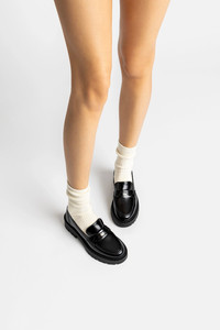 Not your average loafer – Suki Lugsole brings boldness to the classics. With exposed stitching and a chunky lug sole, this style mixes timeless elegance with downtown edge. Wear it with fun socks or contrast it with feminine pieces for an effortless hi-lo vibe. - Black - Glossy box leather - Closed round toe - 2 inches block heel - 1 inch platform - Perfectly fitted rubber lug sole for support, durability, and comfort - Insole with memory foam cushion and hot stamp logo - Handmade in Brazil - SKU: L469-LOND-BLAC-2305