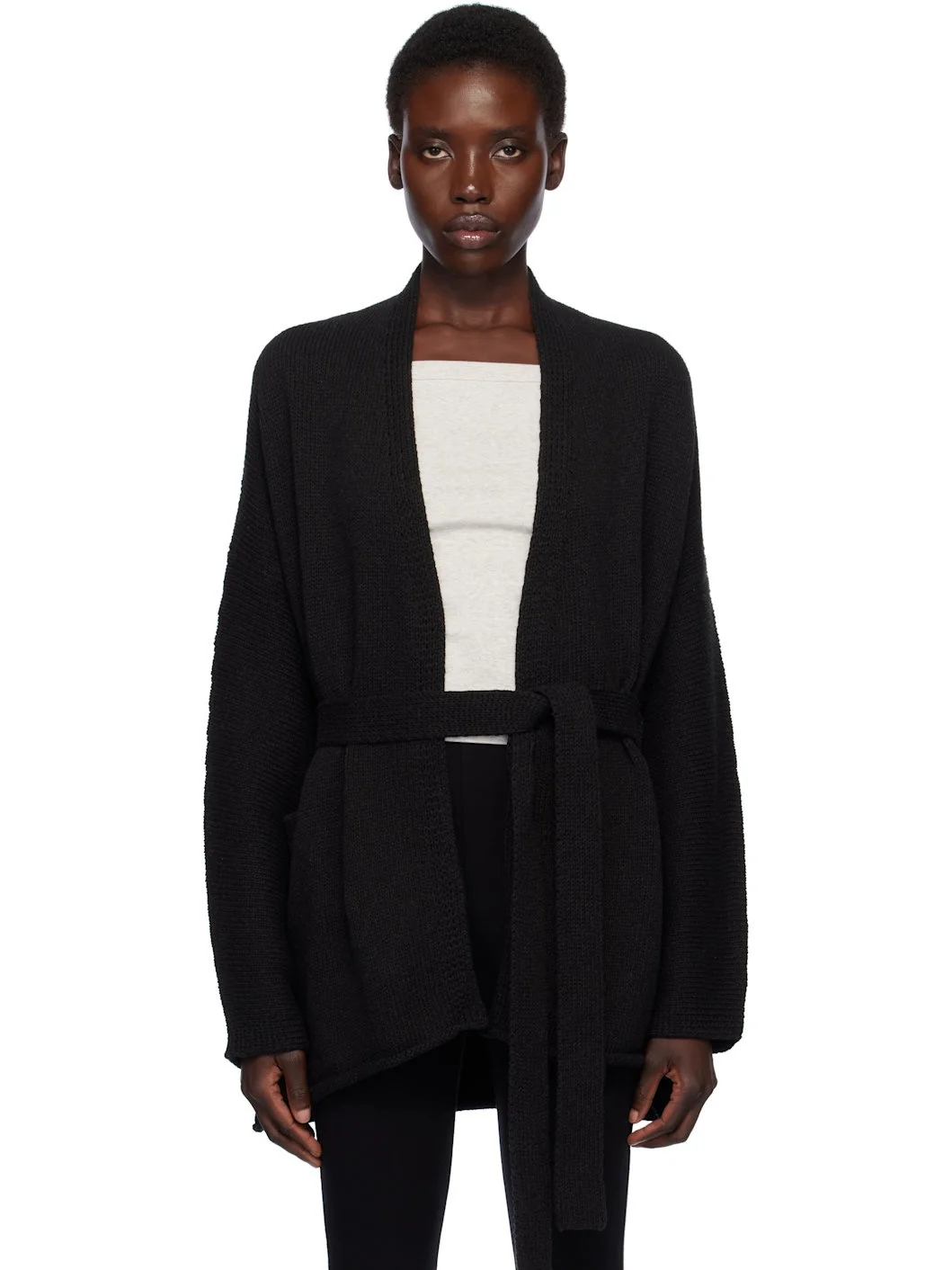 Knit pima cotton cardigan. · Hand-dyed · Shawl collar · Belt loops at waist · Detachable self-tie belt · Rolled edge at hem · Dropped shoulders Supplier color: Black melange 100% pima cotton. Made in Peru 252874F095000