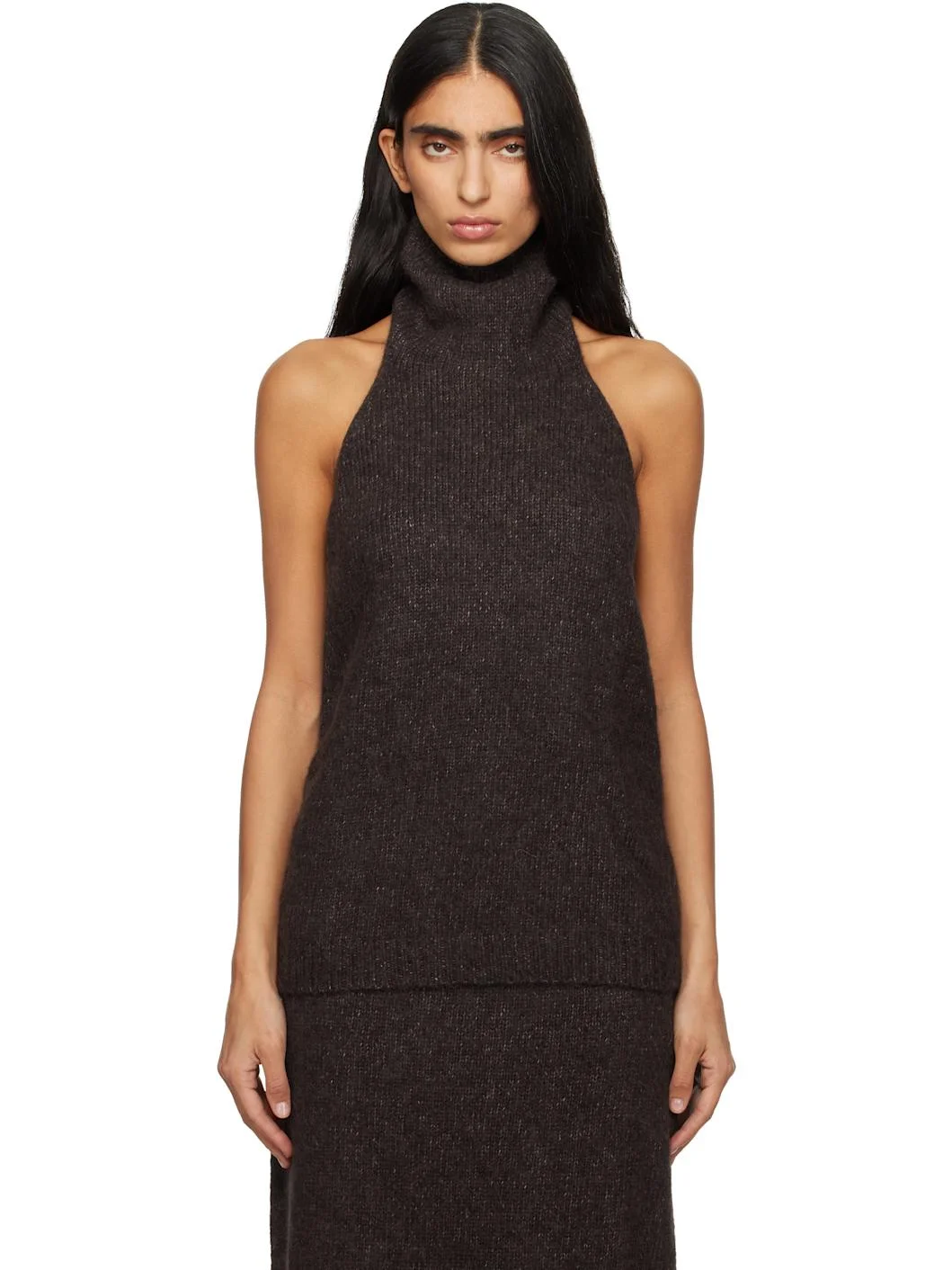 Brushed knit suri alpaca- and pima cotton-blend top. · Hand-loomed · Fixed halter neck · Rib-knit hem · Open back Supplier color: Soil 48% suri alpaca, 31% pima cotton, 21% fine merino wool. Made in Peru 252874F111004