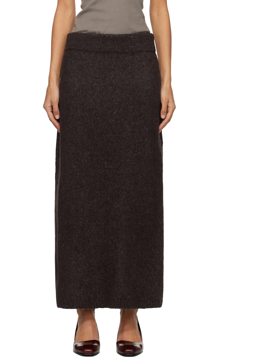 Brushed knit suri alpaca- and pima cotton-blend midi skirt. · Hand-loomed · Elasticized waistband · Rib-knit hem · Central vent at back hem Supplier color: Soil 48% suri alpaca, 31% pima cotton, 21% fine merino wool. Made in Peru 252874F092002